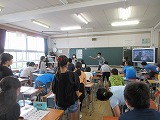 本年度より学習指導要領が改訂され、小学校高学年では週2時間の教科としての外国語、小学校中学年では週1時間の外国語活動を実施することとなりました。高学年では、教科として位置づけられるため、国語や算数と同じように教科書を使用し、「話す」「聞く」だけではなく、文字を「読む」「書く」ことも段階的に扱うこととなります。今日は、ALTのジョベル先生と一緒に6年生が自己紹介の仕方を学習していました。