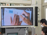 ホワイトボードと単語カードを使って、自己紹介を書いて表現します。まずは、先生がやり方を電子黒板を使って説明しました。