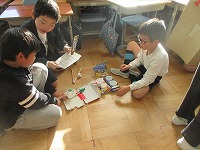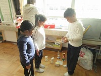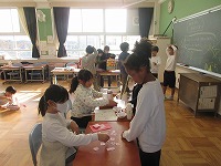 2年生の教室の前を通ると楽しそうな声が聞こえてきました。教室では段ボール箱や空箱、ペットボトルのキャップなど、身近な材料を使って、自分たちで考えた遊びを1組・2組と交流していました。くじびき、もぐらたたき、金魚すくい、パズル、玉とばし・・・・など。遊び方のルールを説明したり、遊んだあとはお礼をいったりするなど、ルールを守って楽しく遊ぶことができた子どもたちでした。