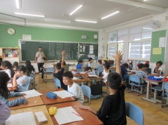 2年生の国語の授業で、谷川俊太郎作の詩を学習していました。「だいち」という詩です。詩の一部を隠して前後の言葉からどんな言葉が入るのか考えました。次につながる動詞から主語を想像したり、主語から動詞を考えたりしました。子どもたちの発想はとても豊かで、楽しみながら詩の学習をしていました。