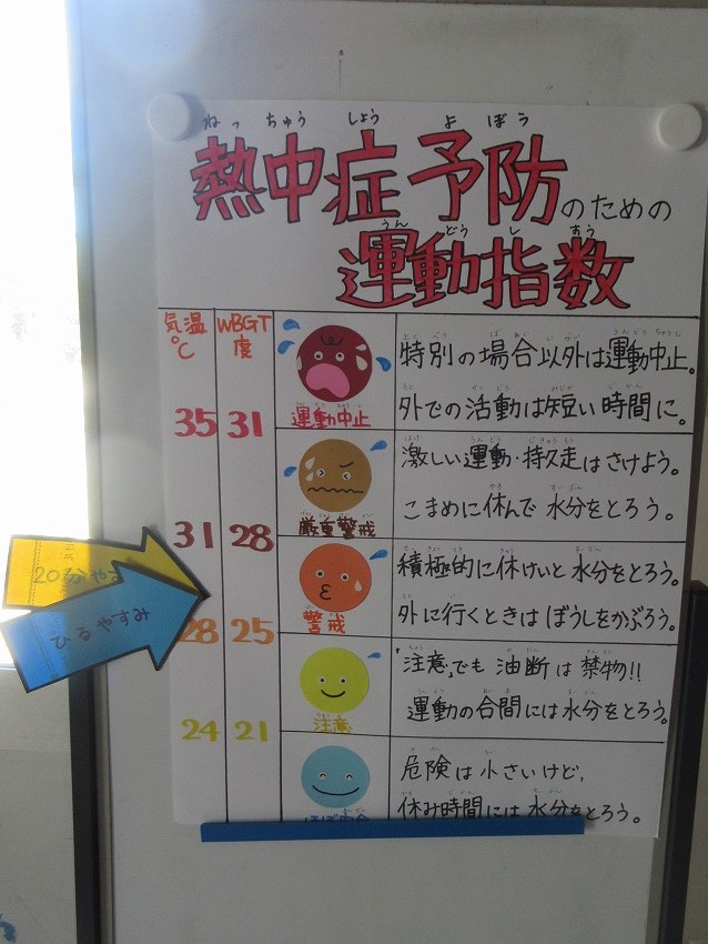 梅雨に入りましたが、今週は暑い日が続きます。保健委員会では、20分休みと昼休みにWBGTの測定を行い、昇降口の掲示板に計測した結果をお知らせしています。今日の昼休みの結果は「気温31.4℃ WBGT26.1」でした。外で遊ぶ時は帽子をかぶり、こまめな水分補給を心がけ、熱中症にならないように気を付けていきたいと思います。
