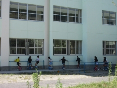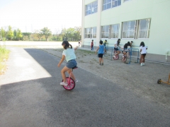 休み時間には子どもたちは元気に外で遊んでいます。ドッジボールをしたり、遊具で遊んだり・・・。2学期に入って、子どもたちの夢中になっている遊びが、虫取りと一輪車です。虫取りチームは、バッタやトカゲなどをつかまえるのに夢中になっています。一輪車チームは、手すりにつかまりながら何度も練習しているうちにずいぶん上手に乗れるようになってきました。