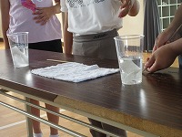 四日市市上下水道局の方にお世話になって、下水道の出前授業をしていただきました。始めに、自分たちが流した水が、どのように処理されているのかビデオをみて確かめました。その後、ビデオで学習した内容をもとにしたクイズに挑戦しました。下水道局の方のお話を聞いて、水が汚れる原因や上手な水の使い方などを学ぶことができました。最後に、トイレットペーパーとティッシュの溶け方の違いの実験をしました。下水道に流せるものと流せないものの違いを、実験を通して確認することができました。