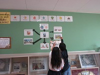 答えは、校長室横のイングリッシュボードに掲示をしています。お昼休みに早速、答えを確かめにきていました。授業の英語の学習から、自分たちで答えを見つけることができました。さすがですね。
