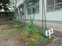 4年生の学級園のへちまが大きくなってきました。花が咲き、つるが伸び始めたため、先生たちがへちまのまわりにネットを設置しました。へちまの実ができる時が楽しみですね。