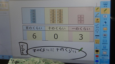 10は10個で100になることを使って、3桁の数のしくみについて考える授業をしました。子どもたちは各自で自分の考えをタブレットに書き込んでいました。