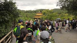 最初の見学地、金閣寺に到着しました。あいにく雨が降ってきましたが、雨空の中でも金閣寺は輝いていました。