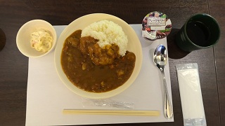 和順会館で昼食をとっています。いつもより朝早くの朝食だったせいか、お腹を空かせた様子の6年生にとっては、カレーライスの香りは刺激的でパクパクと平らげていました。