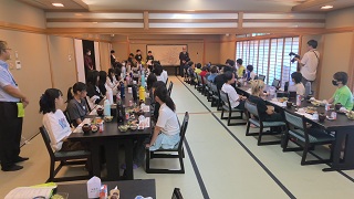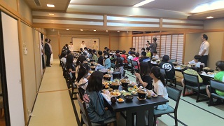 入館式でホテルの方への挨拶をすませて、にぎやかな夕食が始まりました。6年生は、全員元気に過ごしています。本日の配信は、これで終了とさせていただきます。