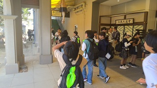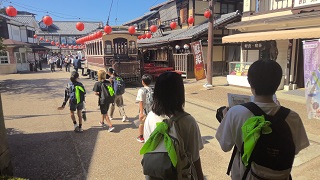 最後の見学地、映画村に到着しました。パーク内は班で自由行動なので、あらかじめ計画した場所をめざしてまとまって出かけていきました。