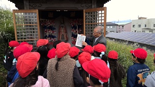 11月5日(水)、3年生が地域学習「てくてく」を行いました。連合自治会にバスを手配いただき、塩浜地区の事業所や歴史ある場所をまわって、地域のことを学習するといった取り組みです。市民センターで、連合自治会長から昔の塩浜や四日市公害についてお話を聞いた後、昭和四日市石油、塩浜運送、大柳地蔵と見学してきました。製油所にある200mの煙突を見せていただいたり、大きなクレーン車の座席に座らせてもらったり、川の氾濫をおさめるために昔から地域の人がお地蔵さんを大切にしていることを教えてもらったりして、自分たちの住む塩浜地区のことをより身近に感じることができたようでした。