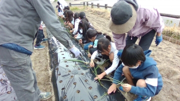 初めに苗の植え方を教えてもらい、あけてもらってある穴に苗を植えて土をかぶせました。
