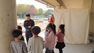 11月21日(金)、四日市南消防署に来ていただき、3年生が防火教室を行いました。水消火器を使って消火作業を疑似体験したり、煙体験をしたりしました。消防車や救助車も見せてもらって、火事や事故から命を救うための装備をたくさん見せてもらいました。