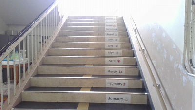 北校舎一階には階段に一つ一つ英語とイラストが描いてあり