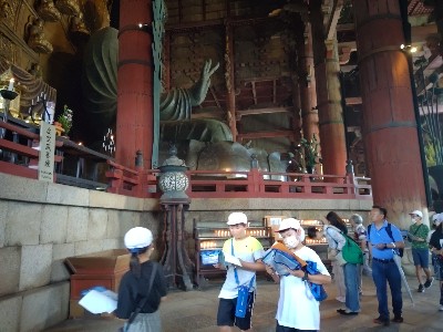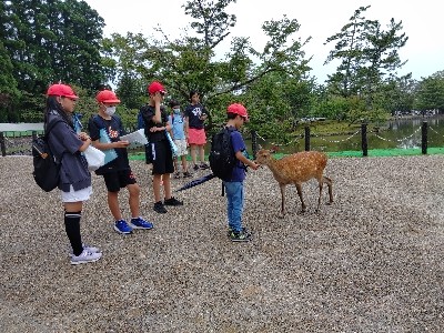 大仏殿の見学を終わり、班で二月堂や鐘楼など見学をしています。鹿せんべいを班であげて、鹿とのふれあいも楽しんでいます。