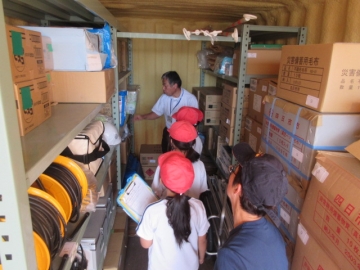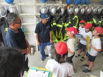 水沢地区防災会を通じて、水沢地区防災会の方、水沢地区市民センターの方、消防団の方にお世話になり、消防団の役割や消防車の見学、防災倉庫の中の見学などを行いました。子どもたちからは、消防団について「出動するときは何人くらいですか」「消火するまでにはどれくらいの時間がかかるのですか」など質問をしながら学んでいきました。また、普段、見ることができない防災倉庫の中を見学を通して、災害時に必要なものがたくさん入っていることに驚いていました。身近な施設で、それぞれの役割の方々がかかわってくださることで、自然災害から人びとを守ることにつながっていることを学んだようです。