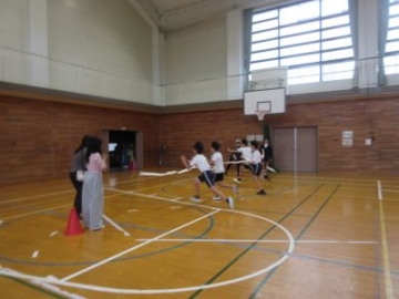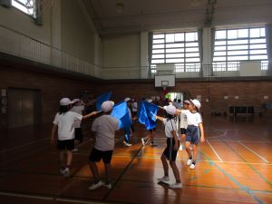 体育館で5・6年生が運動会の練習を行っていました。一人ひとりが大きな旗を持ち、音楽に合わせて高く上げたり大きく振ったりしながら、表現します。旗を振るときには、風を切る音が体育館に響いています。旗の高さや動きが変わるだけで、迫力ある演技にかわっていきました。中には、体をリズムに乗せて弾ませながら演技をする子もおり、音楽に乗って動く心地よさを味わうことができているようです。動きを覚えるのも大切ですが、音楽が鳴ったら自然と踊りだす楽しさを感じながら、運動会に向かっていってほしいですね!