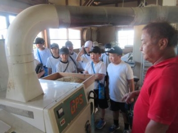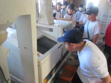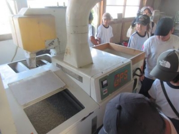 先日、脱穀作業をした籾もしっかりと乾燥しました。今日は、学習支援ボランティアの方にお世話になり、機械による籾すりを見せていただきました。5年生が植えたもち米は、籾がついた状態で14.3kgです。「籾すりをすると、何kgになるでしょう」と、最初は、予想を立てるところから授業は始まりました。選択肢は5kgから13kgで、一番多かったのは、10kgでした。機械が動き始めると、ベルトコンベヤーのように、玄米になっていく様子を順に見ることができました。「何kgぐらいになるのかな?」「こうやって玄米になっていくんだ」など、子どもたちも少しずつ姿が変わっていく様子をしっかりと見学できました。出来上がった玄米は…10.98kgでした。籾すりの後は、約3kg減りました。脱穀は昔ながらの足踏み式、今日は、機械を使っての籾すり、子どもたちもきっと、時代の流れを感じたことでしょう。