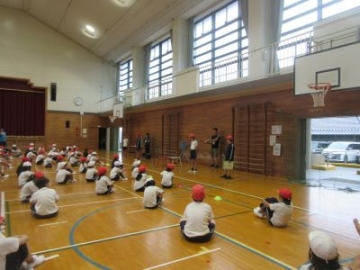 最後の全体練習は、体育館で行いました。運動会の開会式、準備体操(ラジオ体操)、全校ダンス、閉会式の順に練習を行いました。運動場とは違い、スペースも限られていますが、子どもたちはどの学年もきちんと整列し、練習に臨みました。運動会のスローガンは、「みんなで助け合って最後まであきらめずに最高の運動会にしよう」です。今日の練習では、話を聴く姿勢や体操やダンスをするときなど、メリハリをつけて動くことができました。本番は2日後です。スローガンにもあるように、「最後まで」自分の力を出し切っていきましょう!