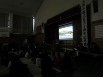 式典は、地域の方々や保護者の皆様でつくっていただいた創立150周年準備委員会の皆様が中心になり、数年間かけて準備をしていただいてきました。委員長からは「水沢小学校が希望とともに、未来に向けて発展してほしい」という願いを込めて、この式典を迎えたことをお話いただきました。ご来賓の方々からもお祝いの言葉をいただくとともに、水沢小学校の歴史を振り返るスライドでは、懐かしい写真やエピソードに驚いたり懐かしんだりする様子もありました。6年生代表の児童から、これまで水沢小学校の歴史を作ってきていただいた先輩方への感謝と未来へ向けての抱負を伝えました。150年間、時代とともに変わってきたこともありますが、変わらずあるのはその時々の仲間と仲間を思いやる心だと思います。子どもたちにもしっかりと引き継いでいってほしいと願っています。