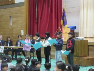 1限めに認証式、表彰、学校集会を行いました。認証式では、3年生以上の各クラス学級委員と5・6年生委員会の委員長に認証状を渡しました。リーダーとしてアイデアを出したりみんなの意見を聴いたりしながら、学校やクラスをよくするために、しっかりと仕事をしてほしいということ、また、リーダーが仕事をしやすくするためにも、周りの仲間が支えていってほしいということを話しました。表彰式では、夏休みや授業で取り組んだ優秀な作品の表彰を行いました。読書感想文、社会科・科学作品展、美術作品展の学校代表に選ばれた子どもたちの表彰です。一人ひとりの作品へのこだわりや丁寧な調べ学習がしっかりとできました。最後に、4・5年生が三泗音楽会で披露してきた合唱の発表でした。体育館には、再び4・5年生の澄んだきれいな歌声が響き渡りました。