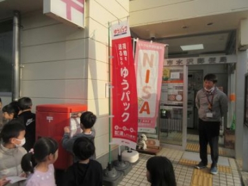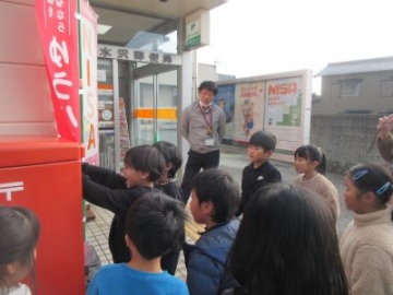 先日、1年生、2年生それぞれの学年で作成した年賀状を、水沢郵便局まで出しにいきました。年賀状は、子どもたちが送りたい相手に向け、新年のメッセージやイラストを入れました。宛名面も、送り先の宛名や送り主の書き方についても、文字の高さや大きさを揃えて書くなど、間違いのないように丁寧に作成しました。ポストの前に来ると、大事そうにゆっくりと投函。きっと送りたい相手の喜ぶ姿を考えながら、投函したことでしょう。郵便局長さんも出てきていただき、子どもたちからは「よろしくお願いします」と直接、お伝えすることができました。