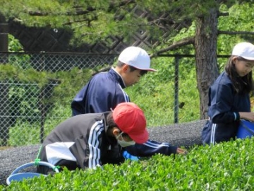 3年生がJAの方々にお世話になり、学校茶園の茶畑に黒い布「クレモナ」をかぶせる体験をさせていただきました。はじめに、職員の方から「日光をさえぎることで、甘みのあるおいしいお茶になる」ことを教えていただくととも、クレモナ(遮光ネット)のかぶせ方やポールを使ったネットの固定の仕方も教えていただきました。子どもたちは、普段から茶畑を見ながら生活をしていますが、実際にネットをかぶせる体験は初めての子も多く、楽しみながら体験させていただきました。やっていくうちにどんどんスムーズになり、茶業に携わる方々の工夫や苦労を知るきっかけとなったようです。おいしいお茶になるための大切な2週間。3年生の皆さんのかぶせたクレモナがおいしさを引き出してくれることでしょう。