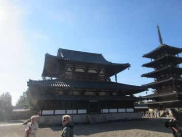 最初の目的地は、法隆寺です。目的地に近づき、塔の上にある相輪が見えてくると、子どもたちも「あれが五重塔かあ」と楽しみにしている様子が伝わってきました。法隆寺では、五重塔や金堂、廻廊、大宝蔵院などを見学し、各所でバスガイドさんからの説明をききながら、丁寧にメモを取る様子もありました。顔を見上げて眺める五重塔、実際に触れてみた廻廊の柱、玉虫厨子や聖徳太子の像、たくさんの仏像など、教科書で学んできたことを近くで見ることができました。