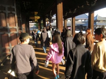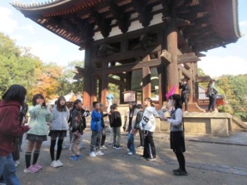 1日め(20日(木))の午後は、奈良公園と東大寺の見学です。子どもたちは、公園の敷地に入ると、「たくさん鹿がいる!」「かわいい」と言いながら、鹿を見るたびに近くに寄っていきました。幸い、だれもしおりを食べられずに済みました。
