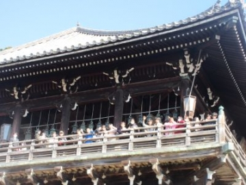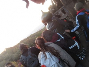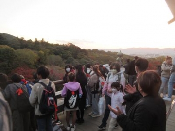 仏足石の説明をきいた後、弁慶の履いていたといわれる鉄の下駄や持っていた錫杖(しゃくじょう)を持ち上げようと、力を合わせましたが…持ち上がりませんでした。清水の舞台からは、京都市内の様子を望みました。遠くには、ろうそくの形をした京都タワーが見えます。夕日とともに見える景色をしばらく眺めていました。