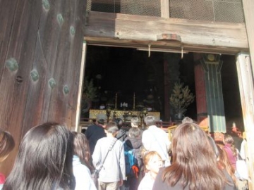 いよいよ東大寺の大仏殿に向かいます。遠くから見えた大仏殿の鴟尾(しび)が近くに見えてくると「こんなに大きいんだ」と驚いていました。中に入ると、正面には大仏の座像が見えます。大仏殿の大きさにも驚きましたが、「こんな大きな仏像をどうやって作るんだろう」と、学習はしてきていましたが、改めて考える場面もありました。大仏殿の端にある階段に興味をもったり、鼻の穴の大きさの柱をくぐり抜けたりと、それぞれに見学を楽しむことができました。