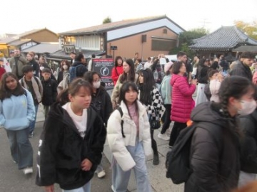 次の目的地は、清水寺です。奈良を後にし、京都へ向かいました。道中、コスモス畑が目の前に広がると、「めっちゃきれいや!」とバスの中から景色を楽しむ声も上がり、秋の景観に感動する子どもたちの感性の良さに触れ、心が温まりました。
