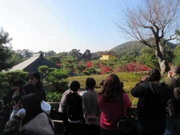 旅館を出発し、次の目的地は金閣寺です。バスの中では、ガイドさんから3階建てのそれぞれの階で建築様式が違うことや正式名称など、事前に見学のポイントや知識を教えていただきました。幸い、思ったより観光客が少なかったため、班ごとに写真を撮ることもスムーズにできました。風が穏やかだったので、池に映る金閣の様子は、班ごとに持っているカメラで撮影をしていました。龍門滝や夕佳亭など、境内の様子も時間をかけてじっくりと見学できたことは、幸運でした。