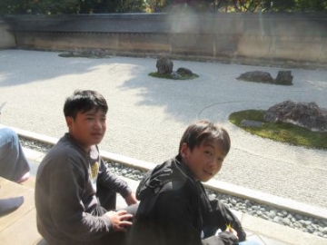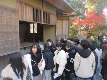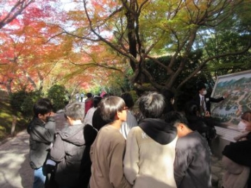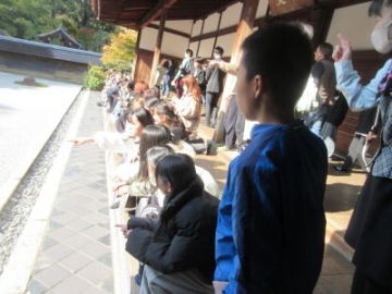 次の目的地は、龍安寺です。参道や池の周りの木々の紅葉がとても美しく、秋の気配を感じながら、歩きました。2日めは、観光客や他校の修学旅行生との重なりも少なく、子どもたちの集合や整列も早かったため、それぞれの場所での見学や体験にゆっくりと時間をかけることができました。龍安寺では、有名な石庭を廊下に腰を掛けながらじっくりと眺めました。15個置かれた石は、どこから見ても14個しか見えません。事前の学習で子どもたちは「完璧な人間はいないことを表しているんだ」と調べてきたことを、実際に確かめていました。