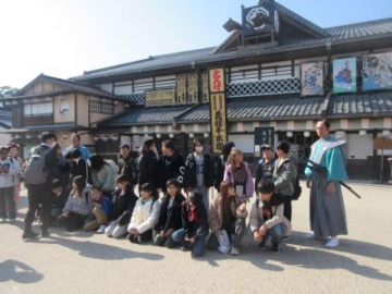 最後の目的地は、太秦映画村です。子どもたちもとても楽しみにしていた見学地の一つです。時間にも余裕があり、アトラクションを体験したり買い物をしたりと、時間たっぷりと十分に楽しむことができました。人気だったアトラクションは、お化け屋敷。「ものすごく怖かった」「目と耳を隠しながら通ったら、怖くなかったよ」と、それぞれに体験の感想を話しながら楽しむ様子がありました。一日めに買うことができなかったお土産も、しっかりと時間をとって買うことができたようです。
