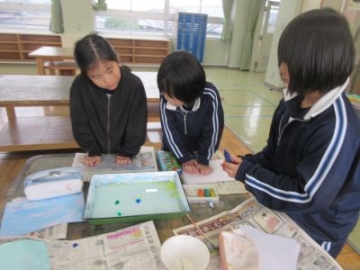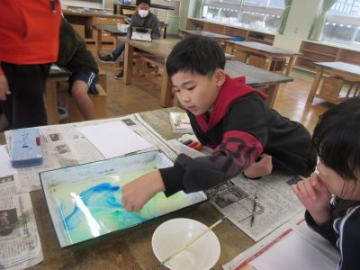 3年生が図画工作科で、絵の具を使ってマーブル模様を描く作品に挑戦しました。バットに水を張り、1滴1滴イメージに合わせた色の絵の具を出していきます。ヘラを使って、そおっと混ぜていった後に、画用紙を浸けると…きれいな色が混ざり合って、マーブル模様が完成しました。班で交代しながら作品を作っていったことで、仲間の作品を見ながら「きれいやなあ」「その色もいいなあ」と互いに鑑賞しながら、作品を仕上げていく関わりが素敵でした。