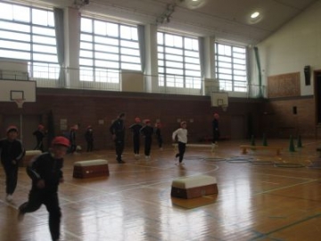 最初の活動は、いろいろな教具を活用したコースで、走ることを楽しみました。小刻みに床を踏みつけるようにステップを踏んだり、左右に片足ずつステップを踏んだりと、全部で6つのコースがありました。子どもたちは、何度もコースに挑戦し、スピードを上げて進むことができるようになっていました。