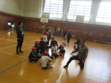 後半は、投げることを楽しむ活動でした。山岸選手からは、「股関節を意識することが大事」と、棒を使ったり片膝を立てて投げたりと、自然と股関節を意識するような投げ方を教えていただきました。山岸選手が投げる見本を示すと「おー、すごい!」と歓声が上がるや否や、すぐに「投げてみたい!」という声。子どもたちは選手のように投げようと動き始めました。明らかにだんだん投げることが上手になってくるなど、子どもたちの柔軟な体と世界で戦う選手に触れることの良さを実感しました。