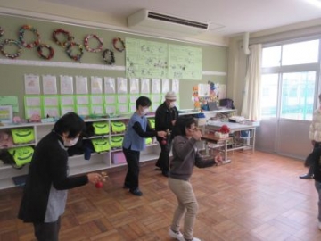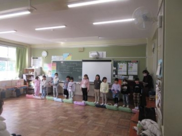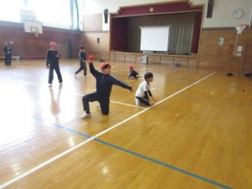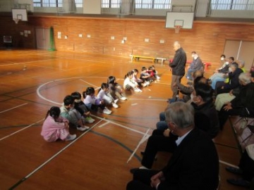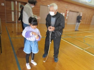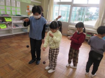 1年生が、白寿会19名の皆様から、子どものころの遊びを教えていただきました。体育館であいさつをした後、早速、体育館と教室の2か所に分かれて活動開始です。体育館では、竹とんぼ、だるま落とし、こま回しです。やり方を教えていただくと、子どもたちもすぐに挑戦し、できるようになってきました。こま回しは、少し難しかったようですが、白寿会の方々の見本がとても素晴らしく、床で回っているこまをひもでひっかけて、手のひらで回すなど、いろいろな技を見せていただきました。子どもたちからも「すごい!」と感嘆の声が上がっていました。教室では、ヨーヨーやお手玉、けん玉を教えていただきました。こちらも楽しみながら、どんどん上手になっていきました。