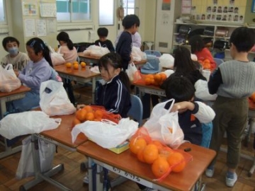 地域の学校支援ボランティアさんにお世話になり、2年生の子どもたちが、農園でみかん狩りをさせていただきました。先日、わらでリースやしめ縄を教えていただいたこともあり、「おはようございます。よろしくお願いします!」と元気よく自分たちから挨拶をしてスタートしました。最初に、ミカンの種類や収穫の仕方のコツなどを教えていただきました。早速、収穫を始めると、だんだん上手になってきて、最後には抱えきれないくらいのみかんを収穫しました。収穫の喜びと地域の方の温かさを、体験を通して学ぶことができました。