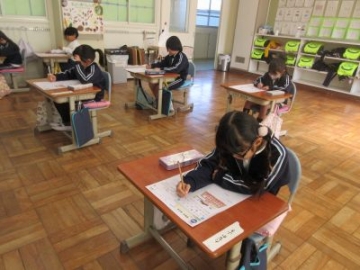 1年生が、算数のテストをしています。今まで学習してきたことを思い出しながら、問題に向かい合っていました。長さを比べる問題では、3本のリボンの長さを比べるために、マスの数を数え、それをテストの用紙にメモをとっておくなど、考えながら問題に取り組む姿から、一人で学ぶ方法をしっかり身に付けていることに感心しました。