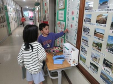 1年生が健康観察のファイルを運んできました。欠席者の数のマグネットを貼り、ファイルをケースに入れます。自分たちだけで仕事をこなす姿が素晴らしいですね。