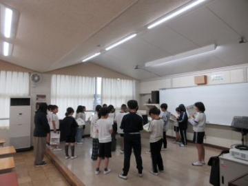 4年生は、初めての音楽室での授業。ピアノの周りに集まって、歌詞を考えながら歌い方を工夫します。教室とは違う場所での音楽を楽しみました。