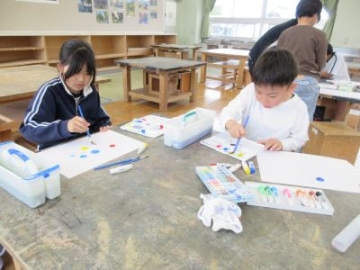 5年生は、図工の授業。絵の具の色を混ぜていろいろな〇を描きました。混ぜる色や量で、全く同じ色はできません。一人ひとり違う作品が出来上がりました。
