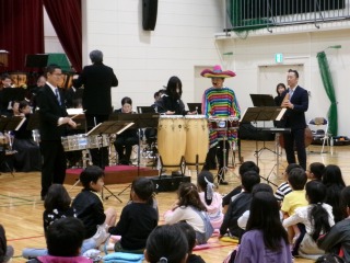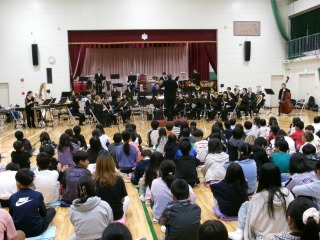 シエナ・ウインド・オーケストラによる鑑賞会を行いました。これは、舞台芸術等総合支援事業の学校巡回公演によって実現したものです。今日は、59名の劇団の方々に素敵な演奏を聴かせていただきました。さまざまな国の音楽を演奏していただきながら、それぞれの国の様子を想像することができるコンサートでした。また、ナレーションを交えながら、小鳥やアヒルなどの動物をフルートやオーボエなどの楽器で表現する演奏を聴かせていただきました。代表の子どもたちが一緒に演奏させてもらったり、全校でビリーブを合唱したりと楽しい時間となりました。子どもたちからの感想と感謝の言葉を伝えて観劇を終えました。