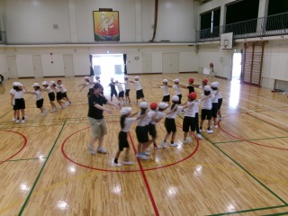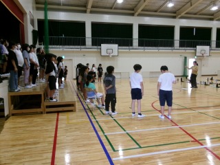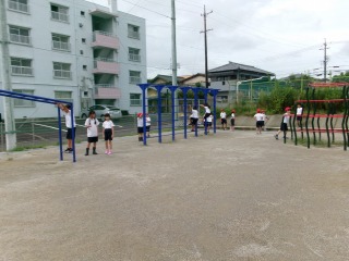 子どもたちが登校するころには雨も上がり、運動場もいい状態で、子どもたちは久しぶりに外遊びを楽しんでいました。鬼ごっこやサッカー、遊具遊びなどそれぞれが友だちと楽しく活動していました。今日は暑さ指数も原則運動禁止にまで上がることはなく、体育館の活動も行いました。3年生は、表現運動や鬼遊びをしていました。友だちとともに体を動かすことの心地よさを味わっていました。5・6年生は、体育館のひな壇に立って合唱の練習をしていました。休憩と水分補給の時間を入れながら活動を進めていました。