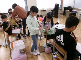 音楽の時間に、初めてリコーダーで♭(フラット)の「シ」の音を出す練習をしました。先生から、「ファ」の音の出し方から中指だけ上げると♭(フラット)の「シ」が出るよと教えてもらうと、すぐに一人ひとりが練習を始めました。