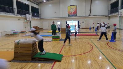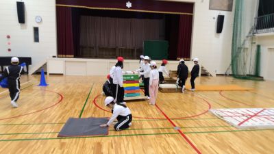 3年生が跳び箱運動に意欲的に取り組んでいました。 助走・跳ねる・手をつく・着地といった一連の動きが必要なため、手首・肩・膝・足首を中心に、丁寧に準備運動を行いました。平均台を使った“跳ぶ動き”の練習場では、子どもたちが自分のペースで挑戦しながら、動きの感覚をつかんでいく姿が見られました。また、個々の力に応じて楽しめるよう、さまざまな段の跳び箱を準備したことで、どの子も自分に合った高さに挑戦することができました。活動の最後では、片づけまで協力して取り組む姿が見られ、みんなで体育の時間をつくるといった温かい雰囲気が感じられました。
