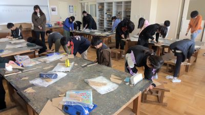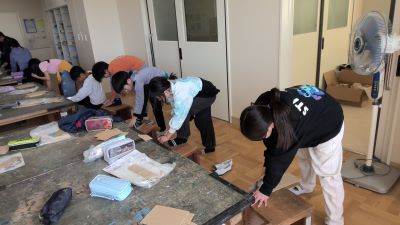 図工室では、4年生が板を組み合わせて作品をつくる活動をしていました。子どもたちはまず、完成させたい作品のイメージを思い描き、そのためには、どんな形の板がいくつ必要なのかを丁寧に計画しました。頭の中のイメージを形にすることはとても難しいですが、友だちと相談したりしながら、真剣に構想を練っていました。板を切る作業では、まっすぐ切り進めることの難しさに苦戦しながら取り組んでいました。ギコギコという音が教室に響く中、腕や体の使い方を工夫しながら集中して作業を進めていました。切り終えた瞬間に見せる達成感と笑顔が印象的でした。1枚の板からどんな作品が生まれるのか、完成がとても楽しみです。子どもたちの創造力と努力がつまった、世界に一つだけの作品が並ぶ日を心待ちにしています。