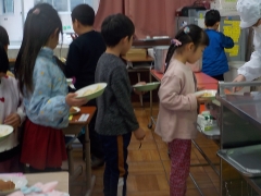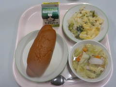 今日の給食は、黒糖パン、牛乳、豆乳グラタン、かぶのスープでした。グラタンが小友たちには、大人気でお代わりの列ができていました。
